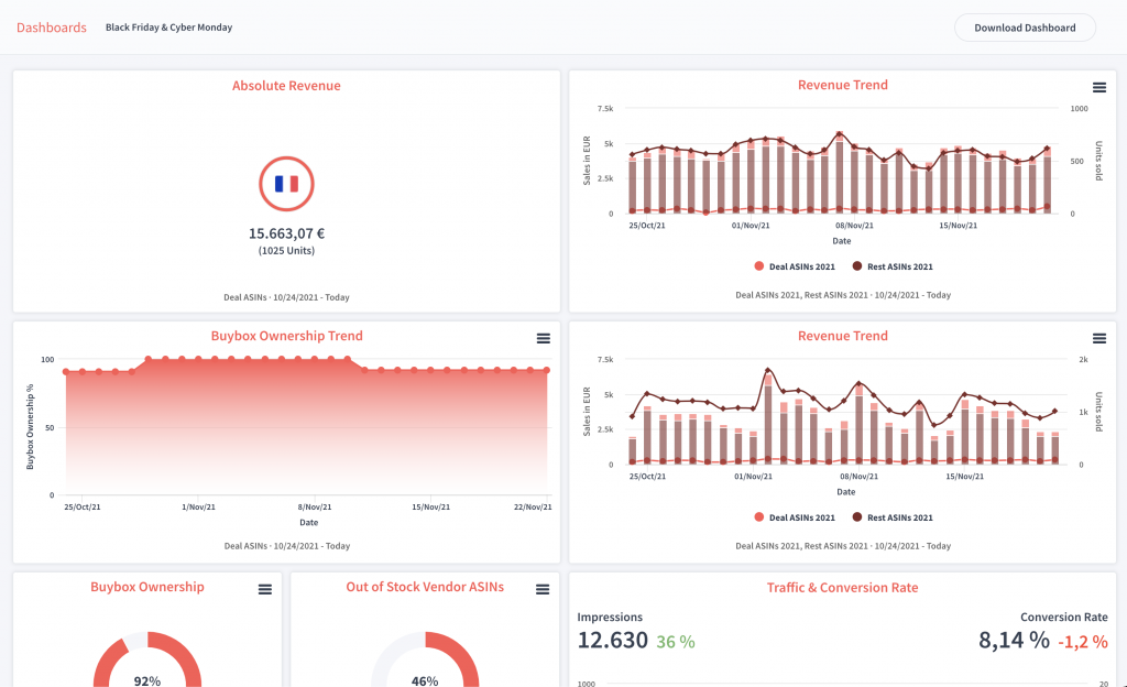 We have crafted a powerful and completely automated dashboard for you to monitor your Black Friday & Cyber Monday performance of your products.